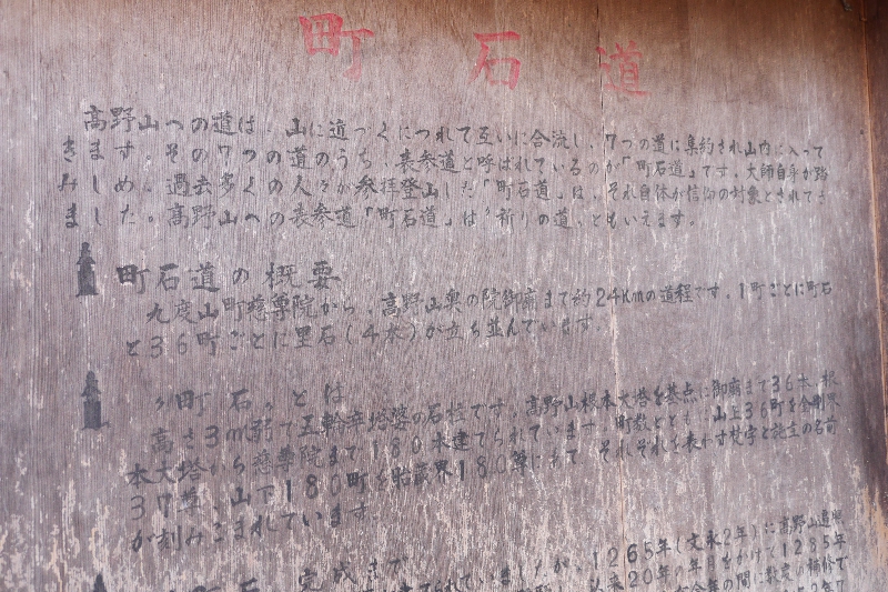 九度山町から高野山へと続く道程で、弘法大師が、高野山へお参りになる方々のために山上の根本大塔から慈尊院までの一町(109m)毎に木製の卒塔婆(そとうば)が建てられて、真言宗のお教をあらわす仏様の姿を塔婆をもって象徴され、高野山の本街道の道標とされました。後、鎌倉時代に現在のような御影石の五輪型卒都婆に建てられました。